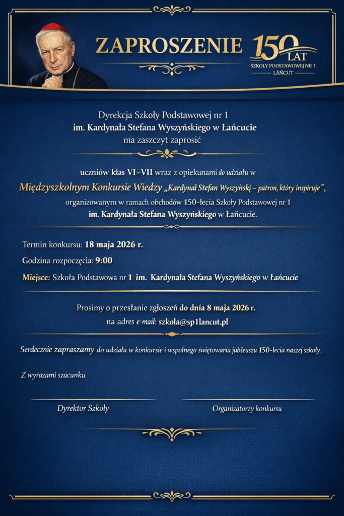 Serdecznie zapraszamy uczniów szkół podstawowych z Łańcuta do udziału w Międzyszkolnym Konkursie Wiedzy o naszym Patronie. To doskonała okazja, by sprawdzić swoje umiejętności, poszerzyć wiedzę i zmierzyć się z rówieśnikami z innych szkół. Zachęcamy do udziału!