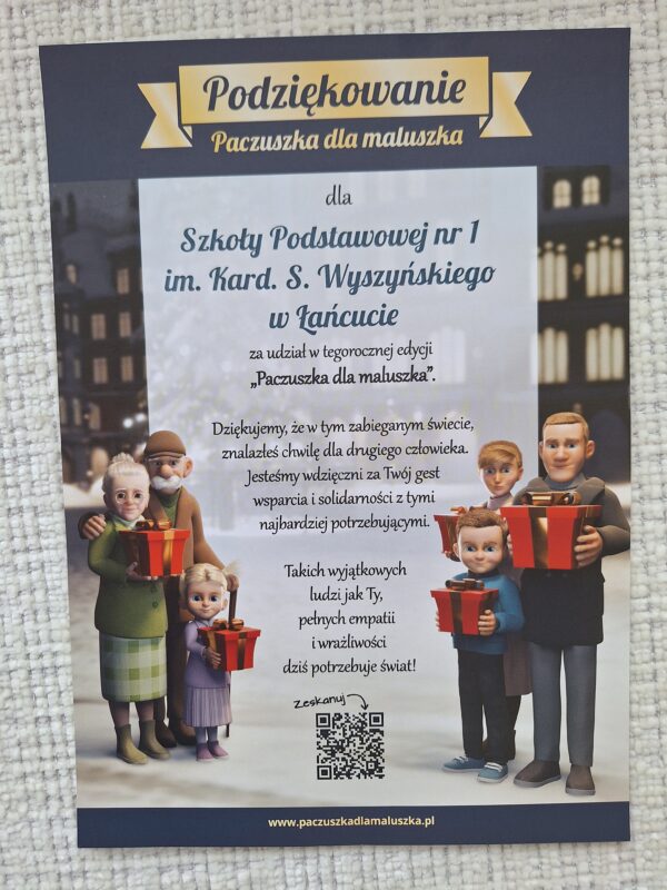 Podziękowanie dla Szkoły Podstawowej nr 1 im. Kard. S. Wyszyńskiego w Łańcucie za udział w tegorocznej edycji „Paczuszka dla maluszka”.